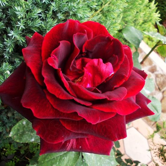 - Крупные, бархатистые цветки темно-красного цвета
